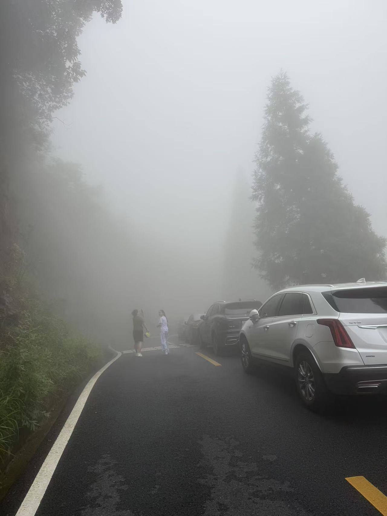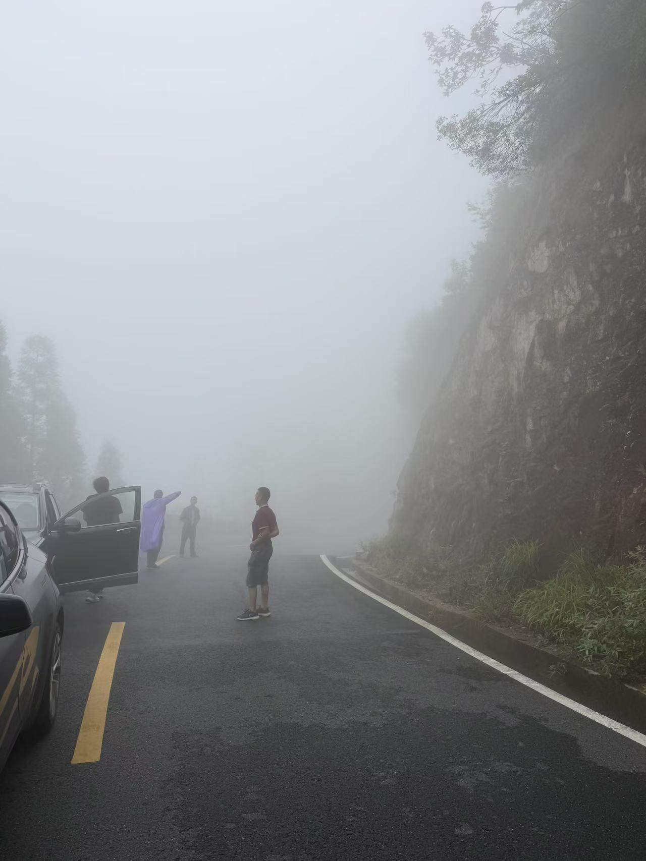 山顶气温不到20度,盛夏的季节出现了浓雾