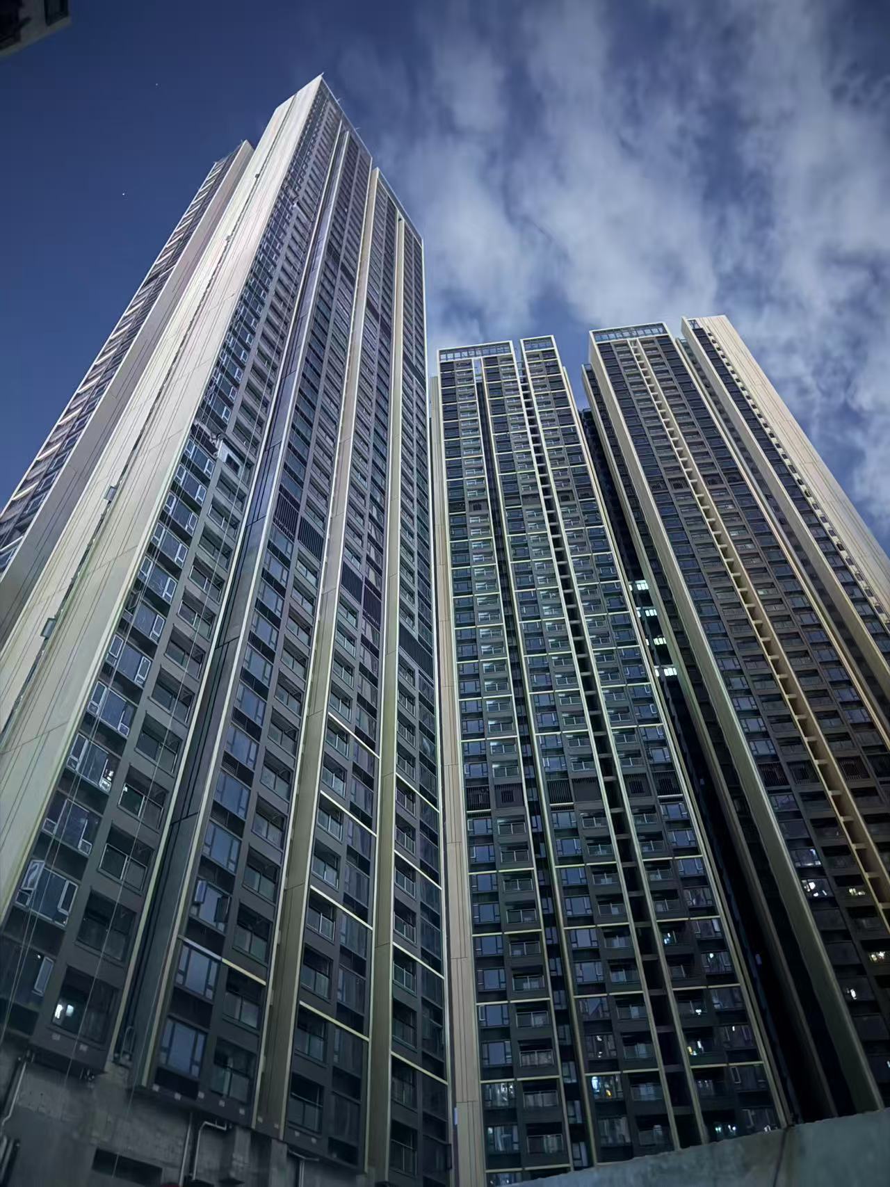 2024-08-22晚上拍摄,有部分楼层亮灯,还有工人在施工。根据热心邻居的说法,咨询了门口的工人,1单元已经在建47层了,封顶指日可待。